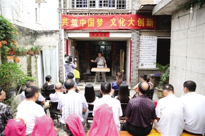 在庭院深深的文化礼堂里,农民诗社负责人潘峰为群众上自己创作的“精品党课”。柯露霞摄