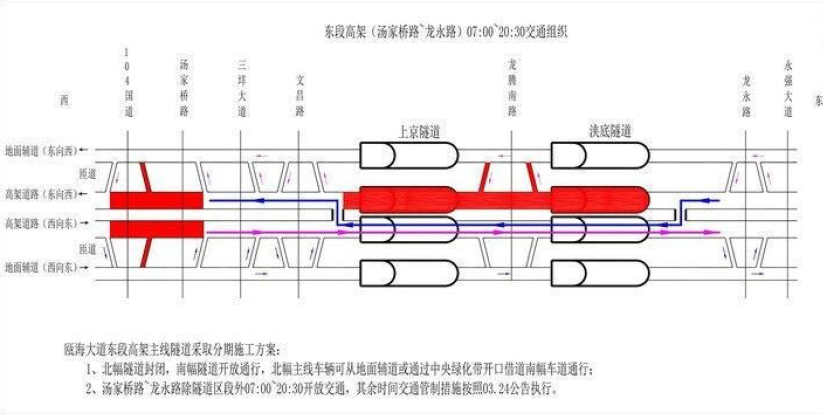 龙湾新闻网4月26日讯(陈出 钟杨帆)记者获悉,4月22日起,瓯海大道主线高架龙永路(茅永公路)至汤家桥段北侧隧道封闭施工,早晨7:00至晚上8:30南侧隧道实行东西双向通车。即东往西方向的车辆,从龙永路匝道口上,从中央绿化带开口借道南侧车道,待通过上京隧道后,再向右通过中央绿化带开口转到北侧车道通行。晚上8:30至次日早晨7:00瓯海大道主线高架龙永路(茅永公路)至汤家桥段仍为封闭施工。