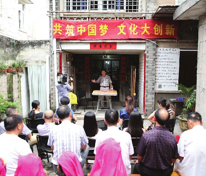 在庭院深深的文化礼堂里,农民诗社负责人潘峰为群众上自己创作的“精品党课”。 柯露霞 摄