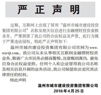 该声明称,近期,互联网上出现了冒用“温州市城市建设投资集团有限公司”名称及相关信息进行金融理财投资虚假业务,严重损害了我公司的合法权益及声誉,此行为属于严重违法侵权,特此严正声明。