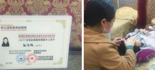 “Yuki”姓汤,乐清柳市人,今年27岁。在该美容店内,记者没有看到任何资质证件,仅在门口接待室的桌子上看到了一本证书,写着“持久造型资深纹绣师”字样,持证者为汤某。