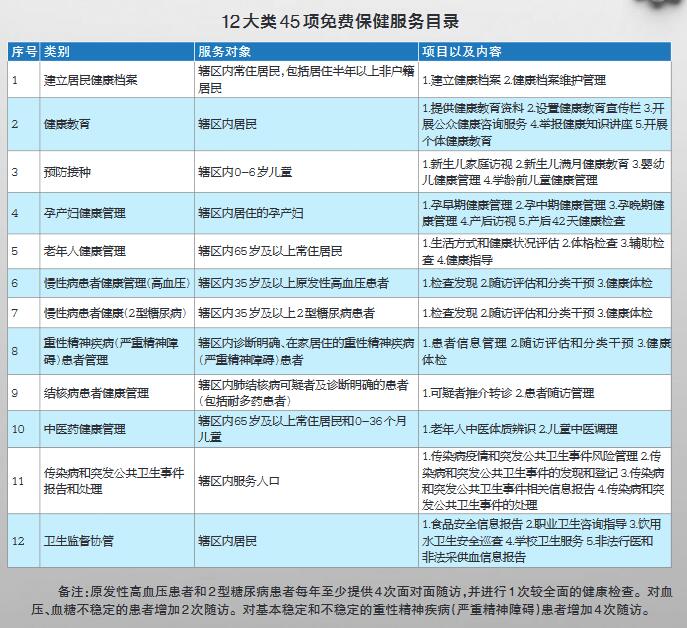 据悉,凡我市常住居民,包括我市户籍的城市和农村居民,以及居住在我市半年以上的非我市户籍居民,都可以享受到辖区提供的免费基本公共卫生服务。今年,我市居民和新温州人可享受到12类45个免费公共卫生服务项目(详见表格)。其中,糖尿病和高血压管理、把居民健康档案建成“动态的活档案”为服务重点。