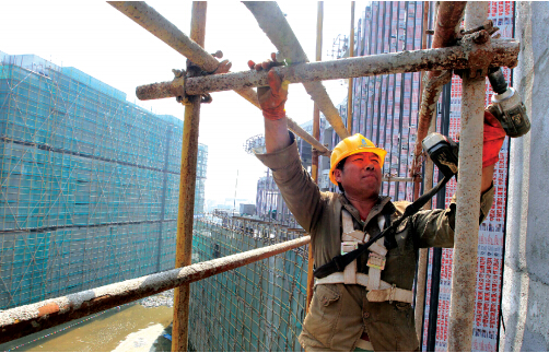 5月1日,工人在龙湾区海滨街道教新村城中村改造一期项目工地上拆除大楼外立面施工钢架,该项目21万平方米的主体工程已完成建设。陈翔摄