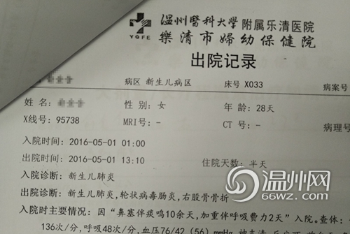 在乐清妇幼保健院的出院记录上写着:“出院诊断:新生儿肺炎,轮状病毒肠炎,右股骨骨折。”
