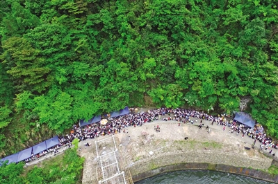 每逢节假日,百丈漈景区因同一时间游客饱和,景区南入口限流或暂停售票,出现景区入口排长队现象。金宏杰航拍