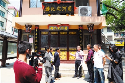 图为村支书向记者介绍前河文化楼由来