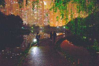 池边的小路就靠远处的灯光来微照亮。杨冰杰摄