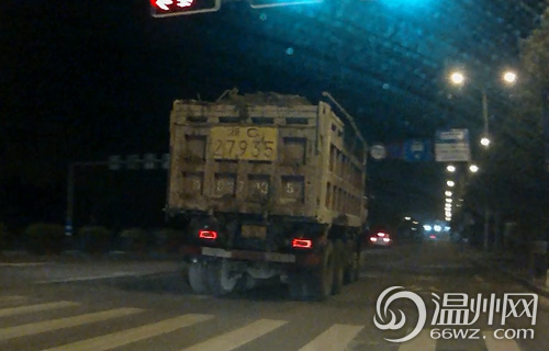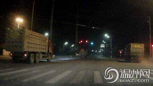 0时11分,在市区瓯江路与海事路红绿灯路口,西往东方向连续2辆无牌照、未遮盖渣土的运输车闯红灯;