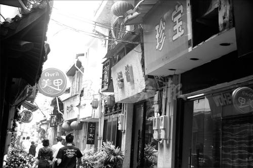 随后,记者一行又来到温州旧城中保留最为完整的一条老街——朔门街。此处拥有不少特色的小店铺,是温州小年轻们夜晚爱逛的地方之一。但也因为店铺众多,这条街上的店招店牌存在着诸多问题。记者粗略数了下,在约100米的一段路上,朔门街两边有30多个不同颜色、不同规格、不同大小的招牌,有些招牌是木质的,有些则是塑料的;有些招牌使用艳丽的暖色系,有些则采用暗黑的冷色调;有些招牌横向放置,有些则垂直挂在墙面上……基本上每一家店铺都拥有风格不同的招牌。