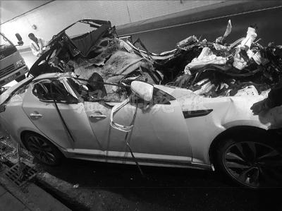 轿车钻入大货车底车顶被削平 幸好人只擦破点皮