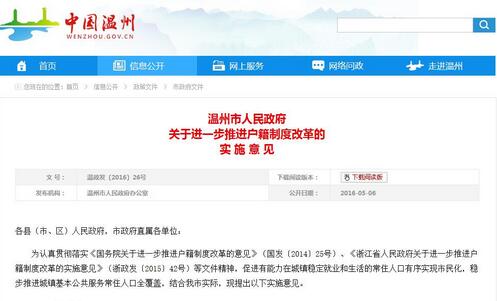 近日,温州市人民政府办公室发布了《温州市人民政府关于进一步推进户籍制度改革的实施意见》(下称《实施意见》)。