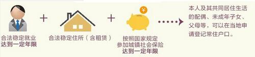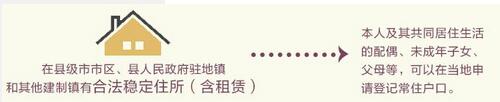 注意:在城镇无合法稳定住所,但城镇经济社会发展需要的引进人才、投资人员和突出贡献人员,以及其他有合法稳定就业且按照国家规定参加城镇社会保险的人员,可以在当地申请常住户口。与其共同居住生活的配偶、未成年子女、父母可以在当地申请登记常住户口。