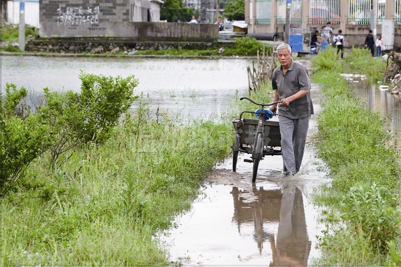 农田被淹,村民只能蹚水而过。