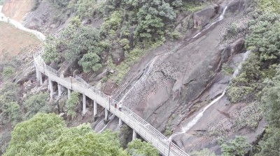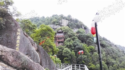 我们沿着石阶路上山。雨后的山谷中,小溪流沿着山涧激荡而下,到处是“哗啦啦”的流水响,响声大得盖过了我们的说话声。道路两边是参天大树,将道路上空遮盖得严严实实,是真正的天然氧吧。没隔多远,路边就会有一座凉亭供人休憩,这些凉亭均由社会各界热心人捐助而建。大约走了20分钟,就看到了山中悬崖上几幢挑角的建筑,悬崖下方的水泥空坦上,也有一座造型独特的多层高亭。同行的登山者介绍,这就是白箬山杨府殿,也是山中一大景观。抬头仰望,只见建筑紧挨着悬崖峭壁而建,地势险要,还有一幢则挨着悬崖上一棵大树而建,建筑隐约可见。