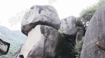 走了一会儿,道路前方的山林突然变了“画风”。只见一片石壁上,很突兀地出现几块怪石,一块如同石“笋”,还有几块石头堆成的圆形巨石在更高处,拼接的石头处有一个大缝隙,透出一道亮光,这就是“飞来石”。