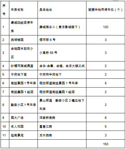 据市城管与执法局信息,该局通过对市区602个地下停车库的69691个停车位进行排查,发现被侵占、挪用的车位数153个(详见下表)。