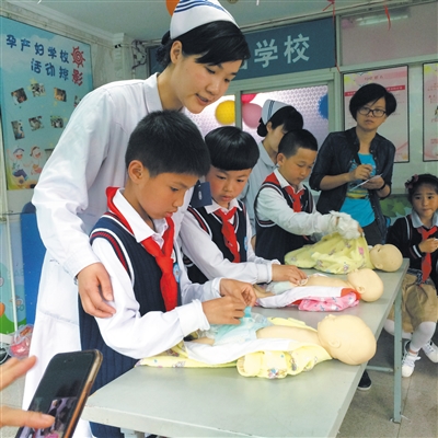 图为孩子们正在护士的指导下学习护理新生儿。