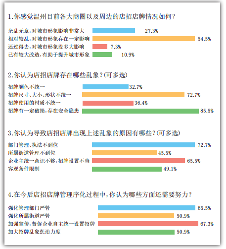 此次调查问卷结果显示,超半数受访者认为我市目前的店招店牌情况“相对较乱,对城市形象存在一定影响”,占总数的54.5%。有27.3%的受访者认为“杂乱无章,影响非常大”;但同时也有一成左右的受访者觉得“已有较大改造,有助于提升城市形象”。
