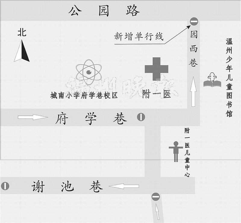 温州网讯为了使温州医科大学附属第一医院府学巷院区周边的交通环境得到彻底改善,交警部门近日把园西巷设为单行线,实行由南往北单向通行。