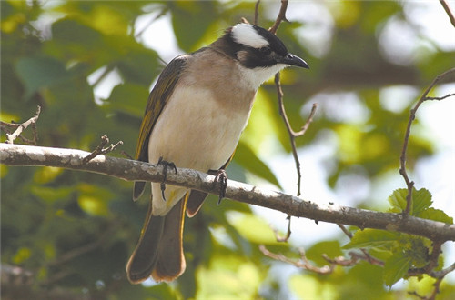 白头鹎(音同杯)分类:雀形目鹎科描述:中等体型(19厘米)的橄榄色鹎。眼后一白色宽纹伸至颈背,黑色的头顶略具羽冠,髭纹黑色,臀白。幼鸟头橄榄色,胸具灰色横纹。分部范围:中国南方、越南北部及琉球群岛。习性:性活泼,结群于果树上活动。有时从栖处飞行捕食。