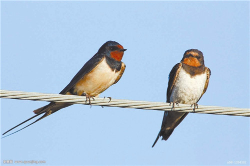 家燕分类:雀形目燕科描述:中等体型(20厘米,包括尾羽延长部)的辉蓝色及白色的燕。上体钢蓝色;胸偏红而具一道蓝色胸带,腹白;尾甚长,近端处具白色斑点。与洋斑燕的区别在腹部为较纯净的白色,尾形长,并具蓝色胸带。亚成鸟体羽色暗,尾无延长,易与洋斑燕混淆。分布范围:几遍及全世界。繁殖于北半球,冬季南迁经非洲、亚洲、东南亚、菲律宾及印度尼西亚至新几内亚、澳大利亚。习性:在高空滑翔及盘旋,或低飞于地面或水面捕捉小昆虫。降落在枯树枝、柱子及电线上。各自寻食,但大量的鸟常取食于同一地点。有时结大群夜栖一处,即使在城市。