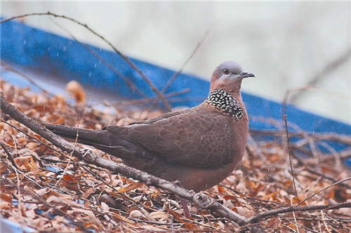 珠颈斑鸠分类:鸽形目鸠鸽科描述:人们所熟悉的中等体型(30厘米)的粉褐色斑鸠。尾略显长,外侧尾羽前端的白色甚宽,飞羽较体羽色深。明显特征为颈侧满是白点的黑色块斑。分布范围:常见并广布于东南亚;经小巽他群岛引种其他各地远及澳大利亚。习性:珠颈斑鸠与人类共生,栖于村庄周围及稻田,地面取食,常成对立于开阔路面。受干扰后缓缓振翅,贴地而飞。