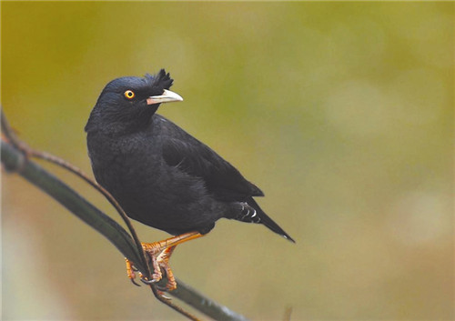 八哥分类:雀形目椋鸟科描述:体大(26厘米)的黑色八哥。冠羽突出。与林八哥的区别在冠羽较长,嘴基部红或粉红色,尾端有狭窄的白色,尾下覆羽具黑及白色横纹。分布范围:中国及印度。引种至菲律宾及婆罗洲。习性:结小群生活,一般见于旷野或城镇及花园,在地面高视阔步而行。