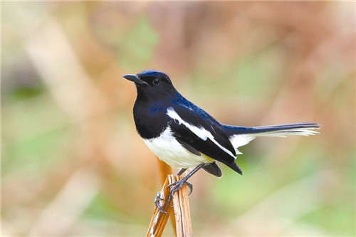 鹊鸲(音同渠)分类:雀形目鹟科描述:中等体型(20厘米)的黑白色鸲。雄鸟:头、胸及背闪辉蓝黑色,两翼及中央尾羽黑,外侧尾羽及覆羽上的条纹白色,腹及臀亦白。雌鸟似雄鸟,但暗灰取代黑色。亚成鸟似雌鸟但为杂斑。分布范围:印度、中国南方、菲律宾、东南亚及大巽他群岛。习性:常光顾花园、村庄、次生林、开阔森林及红树林。飞行时易见,栖于显著处鸣唱或炫耀。取食多在地面,不停地把尾低放展开又骤然合拢伸直。