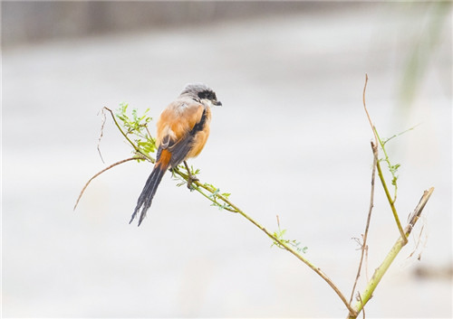 棕背伯劳分类:雀形目伯劳科描述:体型略大(25厘米)而尾长的棕、黑及白色伯劳。成鸟:额、眼纹、两翼及尾黑色,翼有一白色斑;头顶及颈背灰色或灰黑色;背、腰及体侧红褐;颏、喉、胸及腹中心部位白色。头及背部黑色的扩展随亚种而有不同。亚成鸟:色较暗,两胁及背具横斑,头及颈背灰色较重。分布范围:伊朗至中国、印度、东南亚、菲律宾及巽他群岛至新几内亚。习性:喜草地、灌丛、茶林、丁香林及其他开阔地。立于低树枝,猛然飞出捕食飞行中的昆虫,常猛扑地面的蝗虫及甲壳虫。