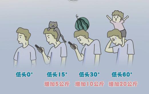 当你低头的时候,颈椎也在默默地承受着压力。低头的度数越大,颈椎的受力随之增加,低头15度时,颈椎承受的重量增加5公斤;低头30度时,颈椎受力增加10公斤;而如果低头60度,颈椎的受力则要增加20公斤,相当于一个小朋友的体重。因此,颈椎承受的重量越高,患上颈椎病的风险也就越高。