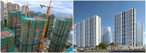 在建中的上江安置房(左)和上江安置房效果图(右)。龙湾区蒲州街道供图