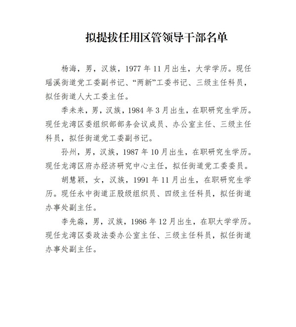根据《党政领导干部选拔任用工作条例》等有关规定的要求,现将拟提拔任用区管领导干部的有关情况予以公示,征求广大干部、群众意见。