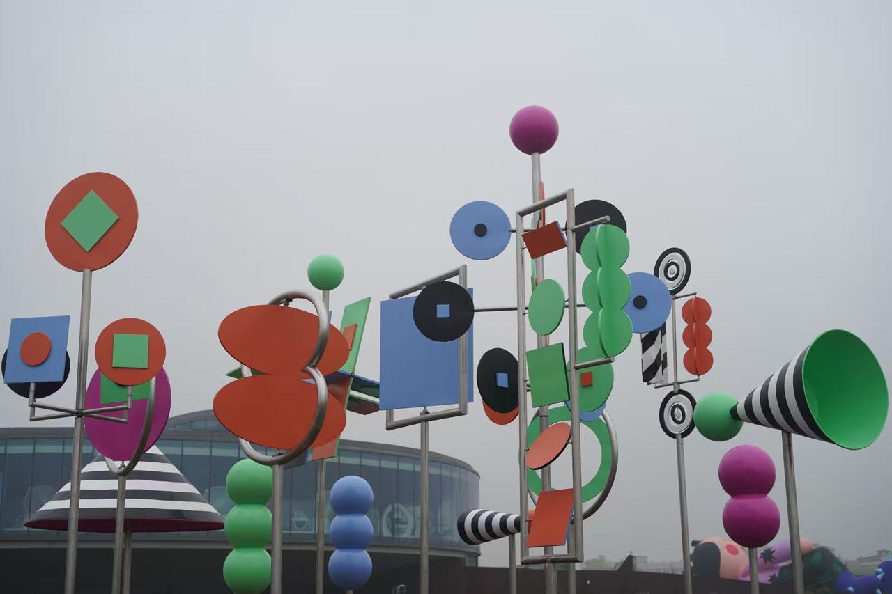 在中国眼谷的“眼瞳草坪”上,美国艺术家组合韦德和莱塔的动态雕塑《驻足,聆听,观看》,将无形的声音与有形的形态完美融合。弹簧跷跷板、球形座椅等城市家具错落其间,游客穿行其中,光影与色彩流转,每个人都能找到属于自己的互动方式。