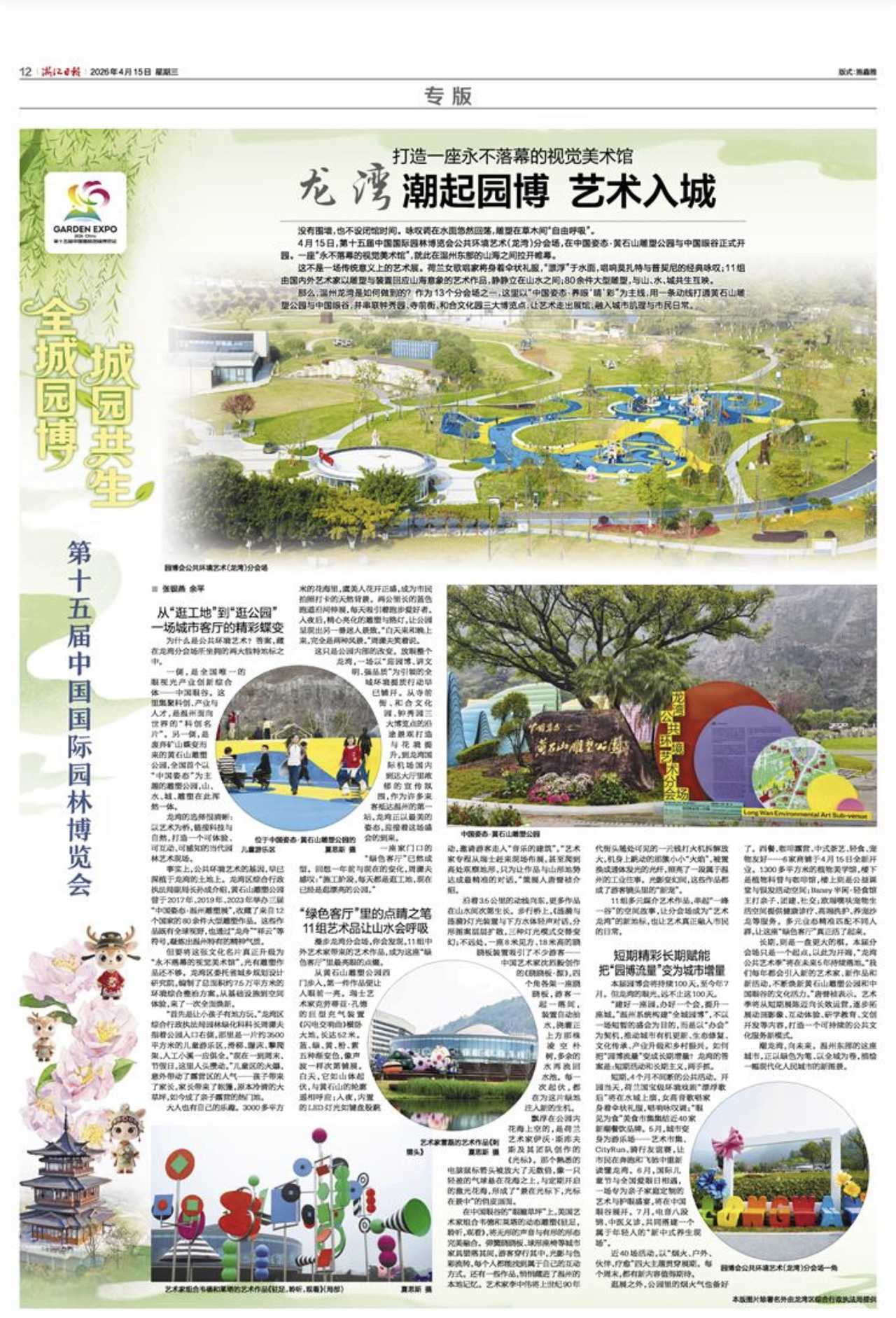 4月15日,第十五届中国国际园林博览会公共环境艺术(龙湾)分会场,在中国姿态·黄石山雕塑公园与中国眼谷正式开园。一座“永不落幕的视觉美术馆”,就此在温州东部的山海之间拉开帷幕。